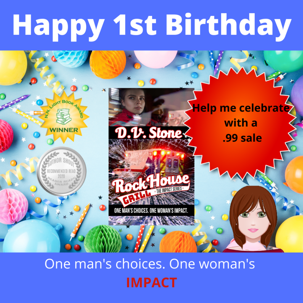 Rock House Grill and I are celebrating our first birthday together. Coming soon is the second Impact book Jazz House. Who knows when that book birthday will be. But I’m sure it will be as sweet as this one. You want to know why? Just like having more than one child, holding each of your subsequent books is an amazing feeling.